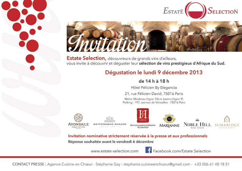 ESTATE SELECTION invite les professionnels de la restauration et de la gastronomie, la presse à découvrir ses grands vins d'Afrique du Sud